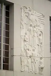 A four-story, trapezoidal structure in an Art Deco-inspired design, includes basement, recessed first-floor and remaining floors overhanging the base.[2] The main facade is oriented west to south, marked by a curved corner and smooth stone facade, broken by a raised marble relief by Américo Braga.[2] The upper floors are distinguished by two large window/glass surfaces on the southeast and northeast facades, broken by patterned lattice of vertical and horizontal beams. The final recessed floor, is marked by six oculi oriented towards the west, that corresponds to the projection rooms of the cinema.[2]