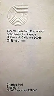 Cinema Research Corporation was founded in 1953 by Charles Pati from Brooklyn, New York. He moved to California at the age of 40 with the dream of getting involved with the film industry in Hollywood. By 1954, he had his first title, The Black Pirates, for which he created the special effects. By the end of that decade, he owned the largest special effects studio in Hollywood. His company, Cinema Research Corporation did titles, opticals, trailers, and special effects.[3]