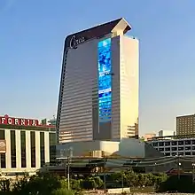 The Circa hotel tower was topped out on June 19, 2020.[24] The tower includes 175,000 sq ft (16,300 m2) of glass paneling.[25] The tower's north side features a giant video screen which promotes the resort. It was built by Daktronics, and measures 228 feet tall and 52 feet wide.[26] During construction, a minor error occurred on the west side of the tower's 30th-floor exterior. Mo Pierce, one of the project engineers, installed a white-colored glass panel in the wrong spot, making it stand out from the rest of the paneling.[19][27][28] By mid-2020, the mistake had gained an online following, and Derek Stevens said the misplaced panel was nicknamed as the "MoDot" and was used as a reference point: "(We'd say) plumbing is going on three floors below the MoDot, we're doing this above the MoDot. It became a noun, it became part of our regular vocabulary."[27] The MoDot was eventually removed, a few days after the resort's opening.[29] Circa was the first new hotel-casino to be built in downtown's Fremont Street area since the D Las Vegas, which originally opened as the Sundance in 1980.[2][30][31]