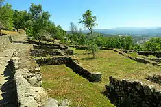 The ramparts and main roads are the most visible part of the site, although there are conduits that carried water from a spring on the hill, fountains, two public bath structures and a large meeting or council house.[1] The ruins of one bath (accidentally found during road work in the 1930s) is the best-preserved construction of its kind in northern Portugal and Galicia.[3] Including a decorative monolith of almost 3 square metres (32 sq ft), called the Pedra Formosa (the "handsome stone") thought to have once formed part of a burial chamber.[8]) Between the second and third line of defences, along the south, is a structure with kiln.[2]
