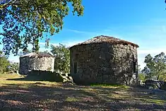 Around 100 residential compounds were found in this area, grouped into small blocks divided by several streets.[1] Each of the compounds, were delimited by masonry walls, and provided living and working space for a large family. These structures included one to three circular stone houses, some large with an atrium, where the nuclear family lived; other structures within the compound housed other family members, served as stables or stored agricultural tools, food, and rain or spring water. Daily tasks and crafts were performed in the stone-paved courtyard of the compound, which formed the center of family life in the citânia.[3] Assuming around 6 people per family unit, a population of the acropolis of around 625 people has been estimated,[3] but estimates may reach as many as 1500 for the entire settlement when excavations are made of the eastern and south-western extremities.