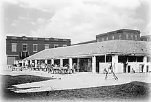 City Market is a historic market complex in the Historic District of Savannah, Georgia. Originally centered on the site of today's Ellis Square from 1733,[1] today it stretches west from Ellis Square to Franklin Square.[2][3] Established in the 1700s with a wooden building, locals gathered here for their groceries and services.[1] This building burned in 1820 and was replaced the following year with a single-storey structure that wrapped around the square.[4] A brick building, the work of architects Augustus Schwaab and Martin Phillip Muller, was erected in 1876.[4] They had submitted plans to the city six years earlier. The cost of the building's construction "vastly exceeded expectations" after excavations revealed weakened arches in the basement floor that required them to be replaced.[5] It was an ornate structure with arches in the Romanesque style and large circular windows.[6]