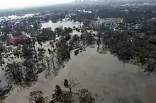 Aerial view from above City Park after Katrina. New Orleans Museum of Art is at center right. New Orleans Fairgrounds can be seen in distance at top left.