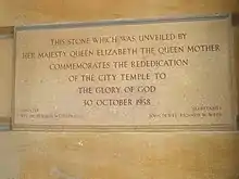 Plaque outside The City Temple, commemorating the rededication in 1958