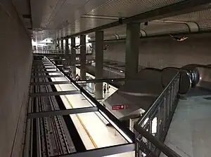 Civic Center/Grand Park station is an underground rapid transit station on the B Line and D Line of the Los Angeles Metro Rail system. The station also has street level stops for the J Line of the Los Angeles Metro Busway system. The station is located under Hill Street at its intersection with 1st Street.[3] It is located in the Civic Center neighborhood of Los Angeles, after which the station is named, alongside the nearby Grand Park.