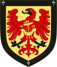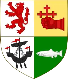 - Chiefly arms: The current chief's coat of arms is blazoned: Or, an eagle displayed gules armed sable surmounted on the breast of a galley of the first within a bordure of the third charged with three cross crosslets fitchée argent. The supporters: (on a compartment entwined with an escrol bearing the second motto) dexter, a bear pierced in the back with an arrow all proper; sinister, an eagle proper. The motto: fortiter; and on the compartment: per mare per terras. The mottoes translate from Latin as "boldly" and "by sea and land". The crest: a dexter arm in armour erect, the hand holding a dagger in pale all proper.[25]
