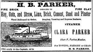 On Sunday, August 7, 1881, Clara Parker, carrying an excursion party, navigated Youngs River to about two miles from the Youngs River Falls.[12] There were many snags in the river, one of which was struck by the boat's wheel, but caused the boat no damage.[12] In June 1883, Clara Parker made runs from Astoria to any and all points on the Columbia river.[13] In 1885 H.B. Parker advertised the steamer Clara Parker for towing, freight, or charter.[7] Clara Parker was in operation in April 1890, running from Portland to Astoria.[14]