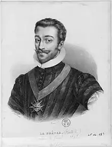 In August 1579 he was among those trusted to represent the prince in his negotiations with the Dutch States General to arrange the prince's ascent to kingship, meeting with a delegation at Tours alongside Marshal Cossé and the Marquis d'Elbeuf.[23] After a month of tense negotiating an acceptable arrangement was hammered out in September.[24] During 1579, La Châtre was inducted into the king's new Order, designed as a replacement for the diluted order of Saint-Michel that of the Saint-Esprit.[25]