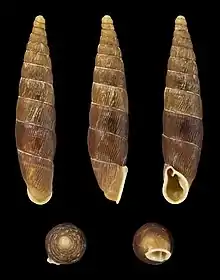 All the species of snails in the family of door snails are left-handed, which is an uncommon feature in gastropods in general. These snails have shells which are extremely high-spired, with numerous whorls.