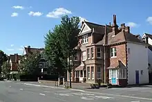 The first recorded commission for the firm, around 1875–76,[14] was a complete rebuild of Blenheim House (56 Old Steine) in the centre of Brighton. This was one of several old buildings (along with Marlborough House and Steine House) on the west side of Brighton's first fashionable area, the low-lying grassland of Old Steine.[15] In 1876–77, they extended the Brighton Friends Meeting House, built for Quakers in 1805,[11] and in 1894 they extended and comprehensively redesigned the town's famous Theatre Royal, partly in response to new fire regulations.[9][16] Much of the firm's early work, though, consisted of housebuilding and surveying in the rapidly developing residential town of Hove, a comfortable middle-class counterpoint to the neighbouring resort of Brighton, in which "a certain gentility prevails" in the spacious streets of finely detailed houses.[17][18] The landmark Gwydyr Mansions at the bottom of Holland Road, a Flemish Renaissance red-brick and ashlar block of mansion flats with integral facilities such as a restaurant and barber shop, date from 1890.[19] Their next work was in Lansdowne Road (1891), Furze Hill (1893), Holland Road (1895: a studio)[20] and Portland Road (1895: several pairs of semi-detached houses and villas).[8][21] On Holland Road, a major north–south route, they were also responsible for shops, flats and a religious institute in 1898, a factory for Green & Company in 1911, and a set of garages in 1925.[20] From 1895, they were the main surveyors to the Vallance Estate, a development of high-class Domestic Revival/Queen Anne-style red-brick housing on land owned by the Vallance family.[17] In particular, they were engaged at Pembroke Crescent and Pembroke Avenue, part of the Pembroke & Princes conservation area, almost continuously between 1895 and 1906, and at Vallance Road and Vallance Gardens until 1907.[8] At the same time, but back in Brighton, they built a seaside convalescent home for French nationals who were patients at the French Hospital in London. The distinctive turreted structure is now Grade II-listed.[22][23] Also contemporary were a veterinary surgery on Goldsmid Road[8] and the small terraced streets between Old Shoreham Road, Sackville Road and the railway line—Frith, Poynter, Landseer, Prinsep and Leighton Roads. Between 1892 and 1900 they also built up Sackville Road, another important north–south route, with shops, houses and the vicarage of St Barnabas' Church.[8][24] In 1894–97, they were responsible for a large complex of school buildings in the Aldrington area of Hove,[8] and in 1900 they designed and built a new hall at the Ellen Street schools in Hove (demolished in 1974)—an elaborate Queen Anne-style building designed in 1877 by Thomas Simpson, under whom Clayton was studying at that time.[8][25] Also in 1894, they were engaged in Royal Tunbridge Wells in Kent to design a Quaker meeting house.[26]