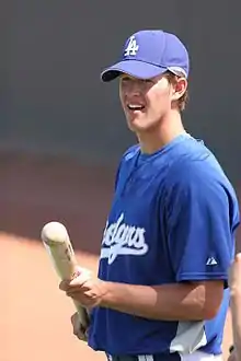 During spring training in a game against the Boston Red Sox, Kershaw gained much attention for throwing a curveball to Sean Casey that started behind Casey but at the end looped into the strike zone and struck him out looking.[30] Kershaw was 0–3 and had a 2.28 ERA with 47 strikeouts through 43+1⁄3 innings pitched in his first stint of the year with the Suns.[31] He was then called up to the majors on May 24, 2008, but optioned back to Jacksonville on July 2.[32]
