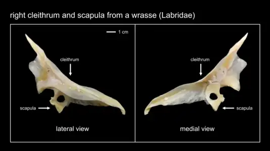 Cleithrum and scapula from a wrasse. The larger bone is the cleithrum.