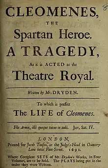 Cleomenes, the Spartan Hero or Cleomenes, The Spartan Heroe: A Tragedy is a 1692 tragedy by the English writer John Dryden. It was first staged at the Theatre Royal, Drury Lane by the United Company. It portrays the reign of Cleomenes, the King of Sparta, inspired by Plutarch's history of the period. Dryden's version is strongly Jacobite in drawing parallels from his overthrow to the recent Glorious Revolution in England. Because of this it was temporarily banned by the authority of Queen Mary.[1]