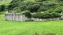 To the west of the castle, a substantial enclosed farmyard was constructed. This comprised a grain store, workers' cottages, stable and coachhouse. Next to it was a walled garden, with a well and pond nearby.[7] On the demesne there are also the remains of a 'marine temple' made of sea shells on the stream to the east of the castle.[6] Close to the road to the north is a children's graveyard, originally for three Eyre children who died in the 1880s.[6]