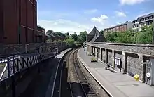 Clifton Down railway station is on the Severn Beach Line, serving the district of Clifton in Bristol. The station is located on the busy shopping street Whiteladies Road, next door to a shopping centre. The wider area is largely residential. Bristol Zoo is under a mile away.[6] The station is located 3 miles 72 chains (6.3 km) along the line from Bristol Temple Meads, and 9 miles 51 chains (15.5 km) from Severn Beach.[27][28][note 1] It is the fifth station from Temple Meads.[29] There are two running lines, roughly oriented east–west, but curving towards the north at both ends. There are two 120-yard (110 m)-long platforms to the north and south of the running lines, connected by a footbridge at the east end.[6] The southern platform, Platform 1, serves trains towards Avonmouth, the northern platform, Platform 2, serves trains towards Temple Meads.[30] The station is in an enclosed cutting, and runs under the road to the east.[6] To the west is the Clifton Down Tunnel under Clifton Down,[6] from which the station takes its name. The station is one of the few double track sections of the Severn Beach Line, and so is often used as a passing place.[31]