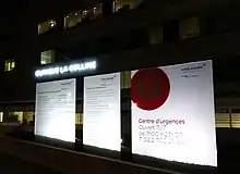 Clinique La Colline houses over 20 consultation practices, an analysis laboratory and medical samples, an orthopedic department, a neurosurgery and back surgery department, a general surgery department as well as many other specialised centers such as an emergency department, a radiology department, a physiotherapy unit, a spa pool and a check-up department.[13][14][15][16]
