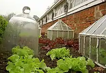 In agriculture and gardening, a cloche (from French, cloche for "bell") is a covering for protecting plants from cold temperatures. The original form of a cloche is a bell-shaped glass cover that is placed over an individual plant; modern cloches are usually made from plastic. The use of cloches is traced back to market gardens in 19th century France, where entire fields of plants would be protected with cloches. In commercial growing, cloches have largely been replaced by row cover, and nowadays are mainly found in smaller gardens.[1]