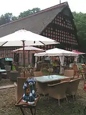 Of the many buildings that were used for farming, the Quatmannshof (from Elsten, built in 1805) and the Wehlburg (from Wehdel, built in 1750) are especially worth mentioning. As well as farmhouses, servants' houses (Heuerhäuser) and farm workers' houses there are numerous examples of rural tradesmen's houses: a turner's, a whitesmith's, a farrier's, a blacksmith's, a coppersmith's,[10] a leather shoemaker's, a clog maker's, a joiner's, a carpenter's workshop, a brewery, a cooper's, a blue printing works, a saddlery, a pottery,[11] a goldsmith's and a silversmith's as well as technical cultural artefacts like grinding mills and engines.[5][12][13]