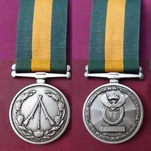 The Closure Commemoration Medal is a military commemoration medal which was instituted by the President of the Republic of South Africa in 2010, to commemorate the disbandment of the Commandos, the rural defence component of the South African National Defence Force.[1][2][3]