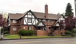 The Clovelly Garden Apartments, also known as Holman Gardens, are a historic apartment complex located in northeast Portland, Oregon, United States. Built in 1928 in the Tudor Revival style, they are a fine example of the garden apartments popular in Portland in the late 1920s and early 1930s. They were designed by prominent architect Carl L. Linde (1864–1945) under commission to George Nease (1874–1958), an influential timber businessman. They contain light fixtures designed by Fred Baker (1887–1981), recognized as a master lighting designer in Portland in that period.[2]