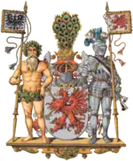 Above the shield was placed a grey (silver) barred helmet with a grey (silver) mantling, and a drapery tied to it. On top of the helmet were a yellow (golden) crown and a ducal hat with a plume of peacock feathers on top. On the sides of the shield was the supporters holding it. To the left, was a wild man, figure depicting an almost-naked male human with a beard wearing oak leaves around his hips, and holding a spear in his right hand. At the top of the spear was attached banner of arms of Prussia, which depicted a black eagle with a yellow (golden) crown on its head, and a yellow (golden) upwards-curved bar, stretched from its chest to the end of its wings, ended in a trefoil, on each of its wings. The creature was placed on a white background. To the right of the shield, was placed a knight in grey (silver) armour, holding a spear in their left hand. At the top of the spear was attached a banner of arms, depicting a red griffin with a yellow (golden) beak and claws, placed on a white background. Both supporters stood on a wooden shelf.[1][26]