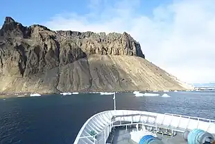 Geologically, the area makes up the Cockburn Island Formation, which was studied extensively in the late 1990s by H. A. Jonkers.[1] Rocks found on the island are volcanic,[2] and the island is characterized by its "precipitous cliffs".[3] A "Pecten conglomerate" from the late Pliocene or early Pleistocene period has been identified on the island, situated on a wave-cut platform at 720–820 ft.[4] The island is a rare volcano type called a tuya, or moberg, which was formed by a three-stage eruption sequence below an ice cap. The first stage was a subglacial hyaloclastic eruption under a thick ice cap, which shattered the lava into glass, ash and sand, which has since weathered to yellow palagonite layers. The second phase was a lava eruption into a meltwater glacial lake contained in the ice cap, which resulted in volcanic breccia and basalt pillow lava (boulders of this can be seen along the shore). The final phase was subaerial basalt lava flows on top of the previous volcanic deposits after the lake drained or boiled away.