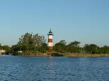 A lighthouse on an island in the town's Municipal Lake Complex.