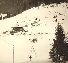 For Christmas 1970 the firm Montagner, of Allonzier-la-Caille installed four lifts adding up to three kilometers of runs: a 1.055.m long lift, to a vertical drop of 265 m and a flow rate of 600 skiers per hour, and a 300 m long lift were installed at the Muret while in the pass, two lifts of 250 m and 200m, were built near the chalet occupied by the syndicate and the ski school managed by Michel Renevier. The staff included ten locals; the day pass was 10 francs. The municipalities widened the road to 14 meters and created a parking lot of 350 cars.[6]