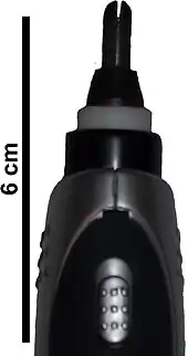 The tip of this apparatus is split into two sections that completes an electrical circuit when a low electrical resistance is placed across the tip; e.g. metallic contacts, or solder.[1] With a current flowing, the resistance of both the solder and the tip produces enough heat to increase the temperature beyond the melting point of solder. For the light-duty work it was designed for, the Athalite tip heats just enough and can cool very rapidly; however, if applied to something with large thermal capacity such as a metal chassis, the tip can become extremely hot and can take over a minute to cool in an extreme case.
