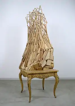 Sterritt began incorporating found furniture and recognizable objects in her work in the 2000s, subverting the "form follows function" dictum in witty, "towering agglomerations" that suggested plants, animals or hybrids (e.g., Daddy-O,[46] 2006).[26][27][47] Her process has been described as resembling a "three-dimensional journal" with each decision and part "unusually transparent," the latter category creating a split mindset in viewers between the integrated sculptures and the disparate, often recognizable, components.[6] The juxtaposition of mass-produced and natural objects opened her work to unpredictable narratives and metaphors investigating the uneasy balance between nature and the built environment in works like One & Nine & Five & Three[48] (2004–05) or Diagramme de Navigation de Mon Coeur (2005), which was described as a "Tatlinesque tower" whose "organic nervous geometry"[21] seemed a meditation on male/female relationships and the flawed promises of modernist utopianism and consumerist comfort.[1][26][6][15]