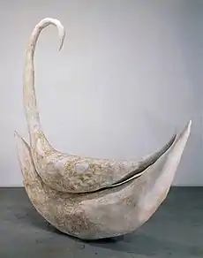 In the later 1980s, Sterritt shifted toward work with smoother surfaces and restrained color, that some writers compare favorably to the work of Martin Puryear or Louise Bourgeois.[8][1] She also undertook greater compositional challenges and expression of movement, that critic Colin Gardner wrote "synthesized classical balance with rugged, idiosyncratic kinesis,"[39] such as Full Quintet (1985),[34] Endear (1987), or Pike: For Earl the Pearl[40] (1988).[41][32] Others recognized greater psychological tenderness and a "quasi-humorous pathos" in her ungainly, "lovable ugly ducklings,"[41] such as the swan-like Flush (1991), which features two forms in relation to explore issues of sexuality and desire, including separation and union, embrace and entrapment.[32][42][3]