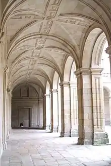 The cloister was built on a Doric-Romanic style with 22 meters of length from side to side. The cloister is supported by heavy pillars of one and a half meters high and surrounds a yard, covered with groined vaults and rosettes that fall between the ribs intersections. In the top-middle of each pillar four different shields represent the different contributors to the building: the first shield represents the Cardinal Rodrigo de Castro; the second one refers to Casa de Lemos; the third one belongs to the Casa de Alba; and the last one stand for Escuelas Pias, representing the contribution of the Piarists Fathers.