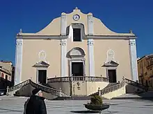 The collegiate church, characterized by the external stone staircase that divides into four branches, with its 2,000 m2 (22,000 sq ft) of surface area, 58.5 m (192 ft) in length, 32.4 m (106 ft) in width and 25 m (82 ft) in height, is the largest church in the diocese of Cerreto Sannita-Telese-Sant'Agata de' Goti.[1] Inside it are preserved numerous 18th-century paintings, valuable wooden statues, some ancient Cerretese ceramic floors, a 19th-century organ in a Baroque case, and some altars made of inlaid polychrome marble.