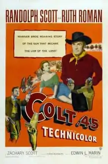 Colt .45 is a 1950 American Western film directed by Edwin L. Marin and starring Randolph Scott, Ruth Roman, and Zachary Scott.[3] Reissued under the title Thundercloud, the film served as the loose basis for the television series Colt .45 starring Wayde Preston, which premiered seven years later. Written by Thomas W. Blackburn, author of the lyrics to The Ballad of Davy Crockett, the film is about a gun salesman and gunfighter who tracks down a killer who stole two new Colt .45 repeating pistols leaving a trail of dead bodies behind him. The revolvers used in the movie were actually first model .44 Caliber Colt revolving belt pistols made in 1849 and reaching final form by 1850. Scott correctly demonstrated how to load them so the producers of the film were most likely aware of the anachronism in the title.