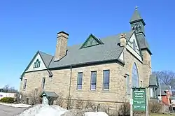 Columbia Baptist Church is a historic church at 25514 Royalton Road in Columbia Center, Ohio. The church was built in 1900 for the local Baptist congregation, which formed in 1832 and had previously used a wood-frame building for its church. The congregation built their church from locally quarried sandstone and gave it a design which combined the Stick Style and Queen Anne style. The church features an intersecting gable roof, a gothic arched stained glass window next to the main entrance, and several smaller stained glass windows illustrating Bible scenes. Its 77 feet (23 m) bell tower has a bell-shaped roof and is the tallest structure in Columbia Center.[2]