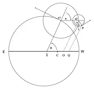 The centre of the second epicycle, represented by the point e2 in the diagram, revolves uniformly from east to west around the circumference of the first, with the same period relative to the radial line joining S to e1. As a consequence, the direction of the radial line joining e1 to e2 remains fixed relative to the fixed stars, parallel to the planet's line of apses EW, and the point e2 describes an eccentric circle[lower-alpha 7] whose radius is equal to that of the deferent, and whose centre, represented by the point O in the diagram, is offset from that of the deferent by the radius of the first epicycle. In his later work, De revolutionibus orbium coelestium, Copernicus uses this eccentric circle directly, rather than representing it as a combination of a deferent and an epicycle.