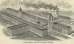 The Commonwealth Shoe and Leather Company is a historic factory complex at 7 Marble Street in Whitman, Massachusetts. The Commonwealth Shoe Company was formed in 1885 by the merger of Charles H. Jones & Co. and Bay State Shoe & Leather Co. The company produced the hugely popular Bostonian shoe, known for its high quality and comfort. The Whitman factory complex was its original site. In 1968, Commonwealth Shoe and Leather merged with Kayser-Roth, which later sold the Bostonian shoe brand to British shoemaker Clarks in 1979.[2] Clarks still produces shoes under the Bostonian brand.[3]