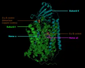 The complex is a large integral membrane protein composed of several metal prosthetic sites and 14[2] protein subunits in mammals. In mammals, eleven subunits are nuclear in origin, and three are synthesized in the mitochondria. The complex contains two hemes, a cytochrome a and cytochrome a3, and two copper centers, the CuA and CuB centers.[3] In fact, the cytochrome a3 and CuB form a binuclear center that is the site of oxygen reduction. Cytochrome c, which is reduced by the preceding component of the respiratory chain (cytochrome bc1 complex, Complex III), docks near the CuA binuclear center and passes an electron to it, being oxidized back to cytochrome c containing Fe3+. The reduced CuA binuclear center now passes an electron on to cytochrome a, which in turn passes an electron on to the cytochrome a3>-CuB binuclear center. The two metal ions in this binuclear center are 4.5 Å apart and coordinate a hydroxide ion in the fully oxidized state.