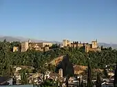 The Concurso was held on the grounds of the Alhambra,[79] at the Plaza de Aljibes on the palace's west end, overlooking the Torre Bermeja and the old city of Granada to the southwest; to the north lay the rising slopes of the Sacromonte (the Gypsi quarter).[80] Perfumed by cypress trees, and with French lavender scattered on the ground for the event, the plaza lay across the crest of a ridge, to which one ascended, entering by way of the Torre de la Justicia. It was decorated for the occasion by the artist Ignacio Zuloaga, whose visual display employed brilliant embroidered textiles and mantones [capes] of Andalucia. After sundown the plaza setting would become a colorful region of lights beside the Arab palace.[81][82]