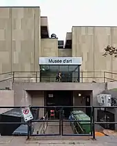 The Confederation Centre Art Gallery building is located in the central business district of Charlottetown, and is situated west of Province House. The art museum forms a part of the larger Confederation Centre of the Arts building complex, which also contains a public library, restaurant, a 1,102-seat theatre for the performing arts, two studio theatres, and several event venues.[4] Designed by Affleck, Desbarats, Dimakopoulos, Lebensold, and Sise, the Brutalist style structure began construction in 1963, and was completed in 1964.[2][6] Designed by Dimitri Dimakopoulos, the exterior of the structure features a reinforced concrete frame, faced with a continuous wall of smooth sandstone.[2] On 30 June 2003, the entire structure was designated as a National Historic Site of Canada.[2]