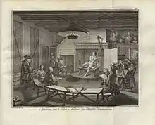 The guild of St. Luke in the Hague existed already in the 15th century and like most large Dutch cities, it catered not just to painters, but were united also with glaziers, engravers, sculptors, goldsmiths, printers and book sellers. In those days guilds were represented in churches with their own altars, and in the case of the painters' guild, they were sponsored by the church, and sometimes even ensured an income for church fathers through donations to the St. Luke's altar. After the Protestant Reformation, this all changed, and the churches were no longer a part of guild life. With the altarpieces gone that had traditionally been the public signboard for the artists, a new venue was necessary for sales. In addition, with the influx of talented painters from the Southern Netherlands cities such as Antwerp, the guild fathers felt that more protective measures were necessary. When securing a new protective charter for the St. Luke's guild failed to have the desired effect, the Confrerie Pictura was set up by 48 dissatisfied painters.[1] They were led by the first deacon and popular Hague portrait painter Adriaen Hanneman.[2]