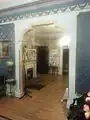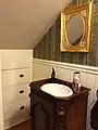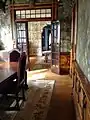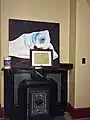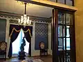 The second parlor, also known as the "drawing room" or "ladies salon" features white wallpaper depicting gnarled trees and fanciful scenes. It contains a large white tile fireplace and mantle straddled by ornately carved wooden griffons.