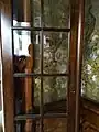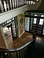 The vestibule is a small space approximately 16 feet square. It's the first space encountered upon entering the home and is separated from the foyer by a double-door. The foyer contains access to the main staircase with a large carved newel post made from cherry and Birds-Eye Maple. The staircase and landings are cantilevered above the first floor and feature a continuous varnished maple railing supported by 102 turned spindles.
