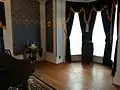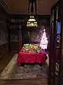 The first parlor, also known as the "blue room" or "Music room" features blue wallpaper inside of decorative wall moldings and is the scene of most seasonal celebrations. During the Christmas season the largest tree is placed in the bay window of this room. It houses the grand piano and Victrola, among other instruments.