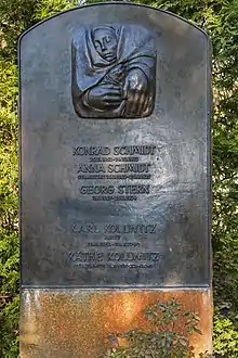 Conrad Schmidt and his wife Anna were buried in the artists' department of Berlin's Friedrichsfelde Central Cemetery. His sister Käthe Kollwitz created the tombstone.[5]