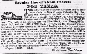 - 1 2 3 Andrew P. Hall (2012). Galveston-Houston Packet: The Steamboats on Buffalo Bayou. Charleston, SC: The History Press. pp. 34–36. ISBN 978-1609495916.