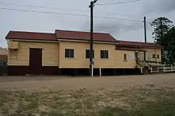 The station building was extended again c. 1916. By this time the 48-foot (15 m) building no longer had a goods shed section, and was instead divided into a ladies room (12 feet (3.7 m) long), waiting shed (19 feet (5.8 m) long), and an office (17 feet (5.2 m) long), the latter having already been expanded from 10 to 16 feet (3.0 to 4.9 m) wide. This configuration of ladies room-waiting shed-office was a common feature of Queensland Railway's standard designs, although the size of each section could be increased, and smaller versions might dispense with one or more of the components. A photograph taken in 1911 shows the goods shed and the station building in its 48-foot (15 m) configuration, with the widened office. It also shows an unknown building, no longer extant, just to the north of the station building.[2]