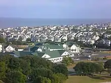 Previously a quiet and little-known location, a development boom in the 1980s sparked growth in the area, and since then, Corolla has become a popular vacation destination. Resting between the Currituck Sound and the Atlantic Ocean, Corolla attracts mainly beach-goers, especially in the summer months. Corolla is home to numerous attractions such as the historic Whalehead Club, Currituck Beach Light, Center for Wildlife Education, and is known for its numerous locations for shopping, dining, and participating in water sports.[3][4]