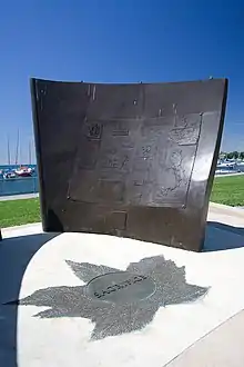 A permanent memorial was designed by John McEwan[16] and erected by the Second World War 50th Anniversary Memorial Tribute Committee in 1995, the 50th anniversary of the end of the Second World War. Named the Victory-Peace Monument, it stands at the water's edge, in a small clearing south of the grove of trees. The monument is formed like an amphitheatre, with a ring of concrete steps around a brick-paved circle, at the centre of which is a black-tinted concrete pad. At its middle is a brass disk, 5.6 metres (18 ft) in diameter, inscribed with the words 1939 1945 PEACE and the word peace in other languages. Six of the surrounding steps have black granite blocks approximately 60 centimetres (24 in) by 67 centimetres (26 in), each being etched with words or artwork relevant to the war. On a platform at the south are also a set of bronze walls, formed like a ship's prow and bearing artwork depicting Canada's involvement in the Second World War. Between these is a maple leaf cast into the concrete and engraved with the word Sacrifice.[17] Just to the east is a tall flagpole with a victory garden planted around its base.[18]