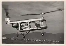 On his return to Italy after a year in 1919, D'Ascanio again settled in Popoli, focused on the control mechanisms for helicopters, through which he derived a number of patents. In 1925 he founded a company with Baron Pietro Trojani, which commissioned by the Ministry dell'Aeronautica produced in 1930 its third prototype, the coaxial D'AT3. This relatively large machine had two double-bladed, counter-rotating rotors, with control achieved by using auxiliary wings or servo-tabs on the trailing edges of the blades,[2] a concept that was later adopted by other helicopter designers, initially by the French Breguet-Dorand Gyroplane Laboratoire in 1935, and still later by designs from both Bleeker and Kaman. Three small propellers mounted on the airframe were used for additional control of pitch, roll, and yaw. Piloted by Marinello Nelli in October 1930 at Ciampino Airport, this machine held modest Fédération Aéronautique Internationale speed and altitude records for the time, including altitude (18 m), duration (8 minutes 45 seconds) and distance flown (1,078 m).[2][3] D'Ascanio's altitude record would be "unofficially" shattered by the Soviet-built, Yuriev-Cheremukhin TsAGI-1EA single-lift rotor helicopter in mid-August 1932, with a 605 meters (1,985 ft) altitude achievement, and also possessed fore-and-aft tubular fuselage structures for similar "anti-torque" stabilization rotors.[4]